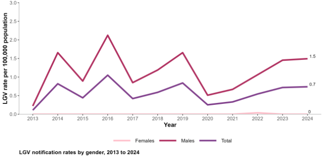 Lymphogranuloma venereum (LGV) by gender, 2013 to 2024